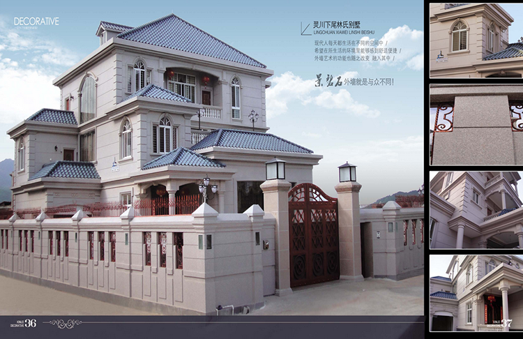 適用于山莊別墅、酒店、賓館、娛樂場(chǎng)所、商業(yè)會(huì)所等建筑物內(nèi)外墻大面積使用。